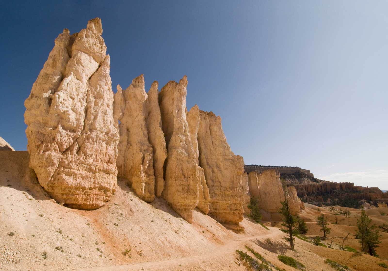 トレイルは穏やかにうねり、ポンデロサパインと古代のダグラスファーのクラスターの間を織ります。トレイルに沿ってさまざまな視点が現れ、それぞれが円形劇場と下の赤オレンジ色のフッドーの迷路の新しい視点を提供します。