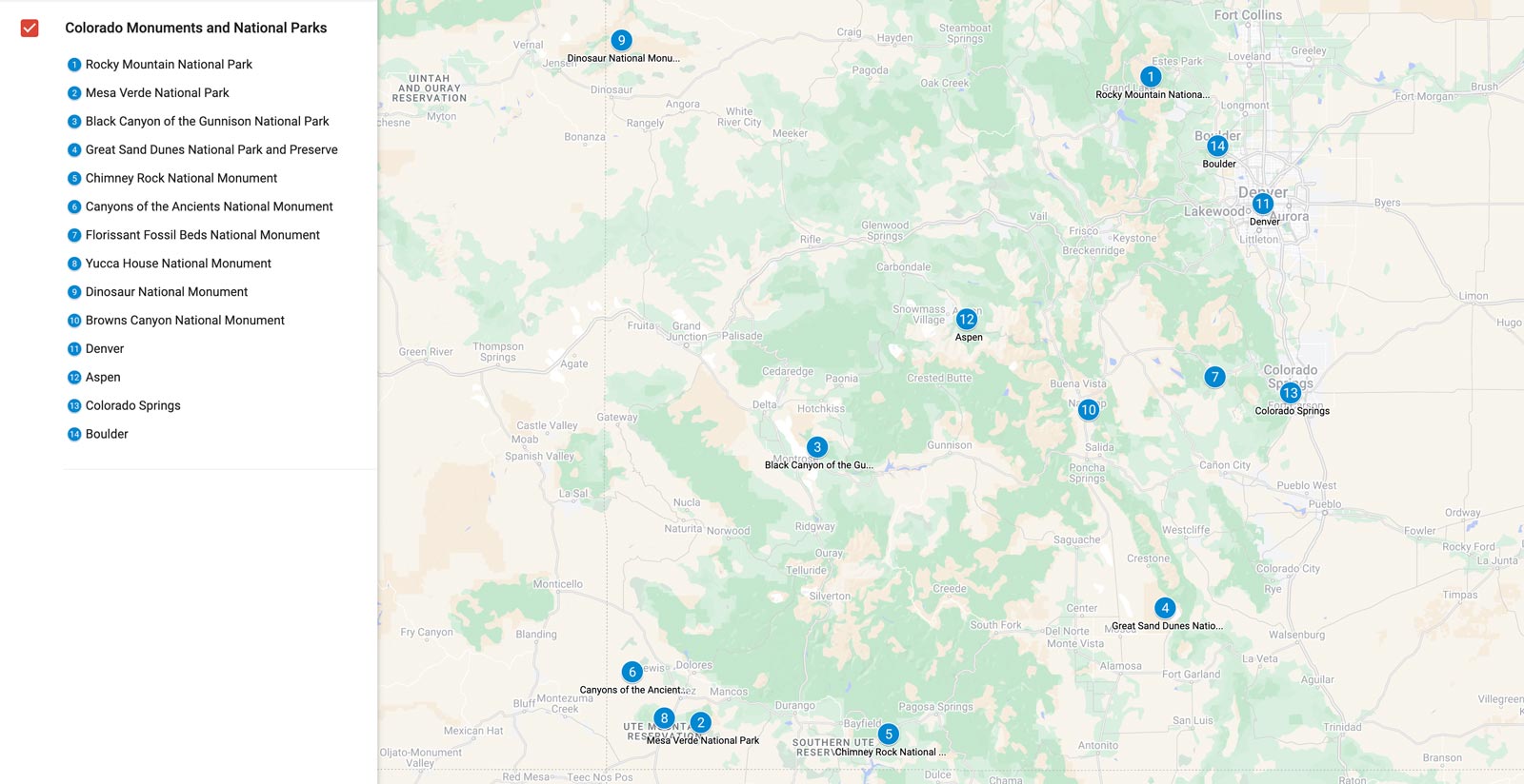 コロラド国立公園と記念碑の地図