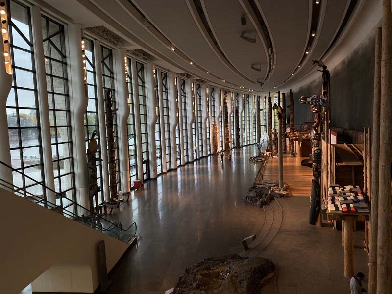 建物に入ると、グランドホールはカナダの西海岸からのトーテムポールと先住民の建築物の巨大な展示であなたを襲います。