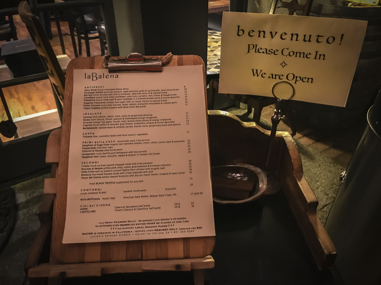 カーメルの中心的な場所で、私たちは夕食の予約から歩いてすぐでしたトスカーナ料理のバレナカーメル。ジュニパーストリートは、カーメルのレストランやカフェのために起こっている通りのようで、隠れ家とラバレナの両方がその上にあります。
