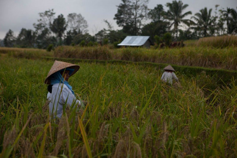 日没のためにタナロットに向かって戻る途中、プトゥは2人の女性が米を収穫しているのを見つけたとき、道路停止の別の即興側に私たちを導きました。