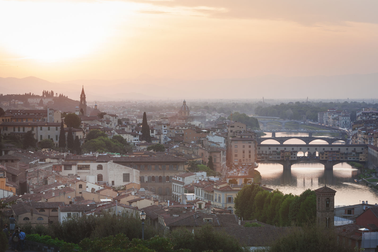 サンセットのフィレンツェの最高の景色の1つは、ミケランジェロのデビッドの巨大なレプリカを見つけるためのミケランジェロ広場です。丘を少し歩いて行くか、その頂上までバスに乗ることができます。私たちは、ピアッサ・デラ・シニオリアからアルノ川を渡ってポンテ・ヴェッキオを走ってミケランジェロ広場まで歩いてきました。