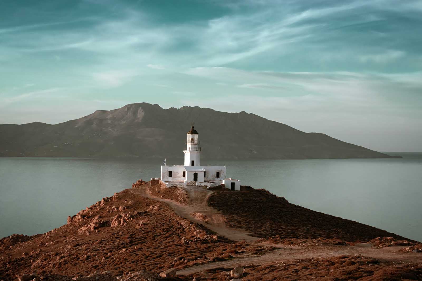 灯台は島の北西海岸にあり、カラフルな地平線の抑制されていない景色と、さらに小さな島のティノスがあります。ここにも簡単にアクセスでき、ミコノスの町からたった4マイルのバスやタクシーです。