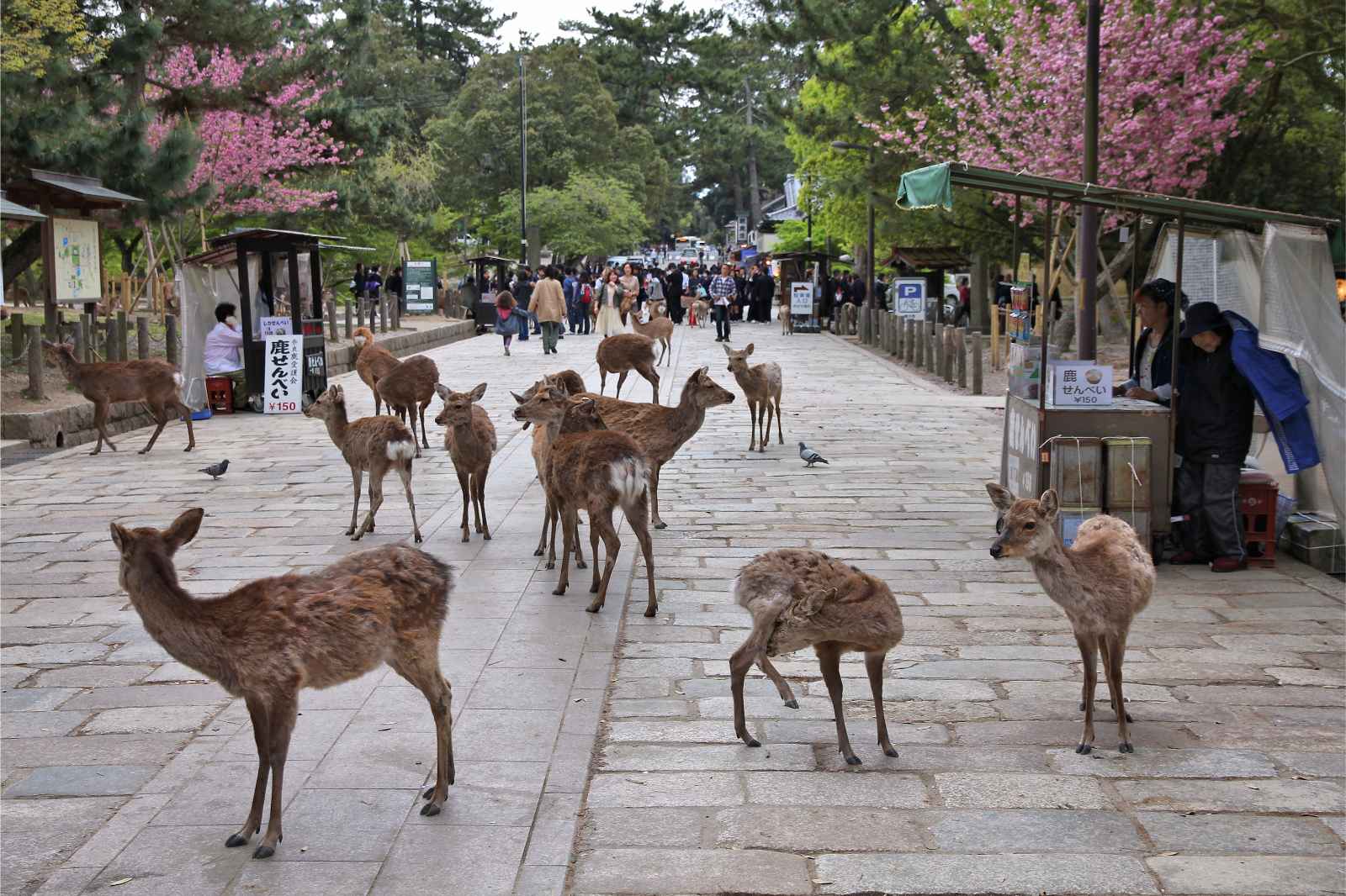 奈良公園は、特にその地面を自由に歩き回る鹿で知られています。それらはすべて飼いならされており、クラッカーを購入して養うこともできます。一部の鹿は、あなたをより多くの餌を与えようとしようとする試みであなたにお辞儀をします。子供たちは特にこの経験を楽しんでいます。公園は家族にとって本当に素晴らしい場所です。春の奈良公園を訪れて、すべてのサクラの木が咲いているときに、完全な栄光のある場所を楽しんでください。