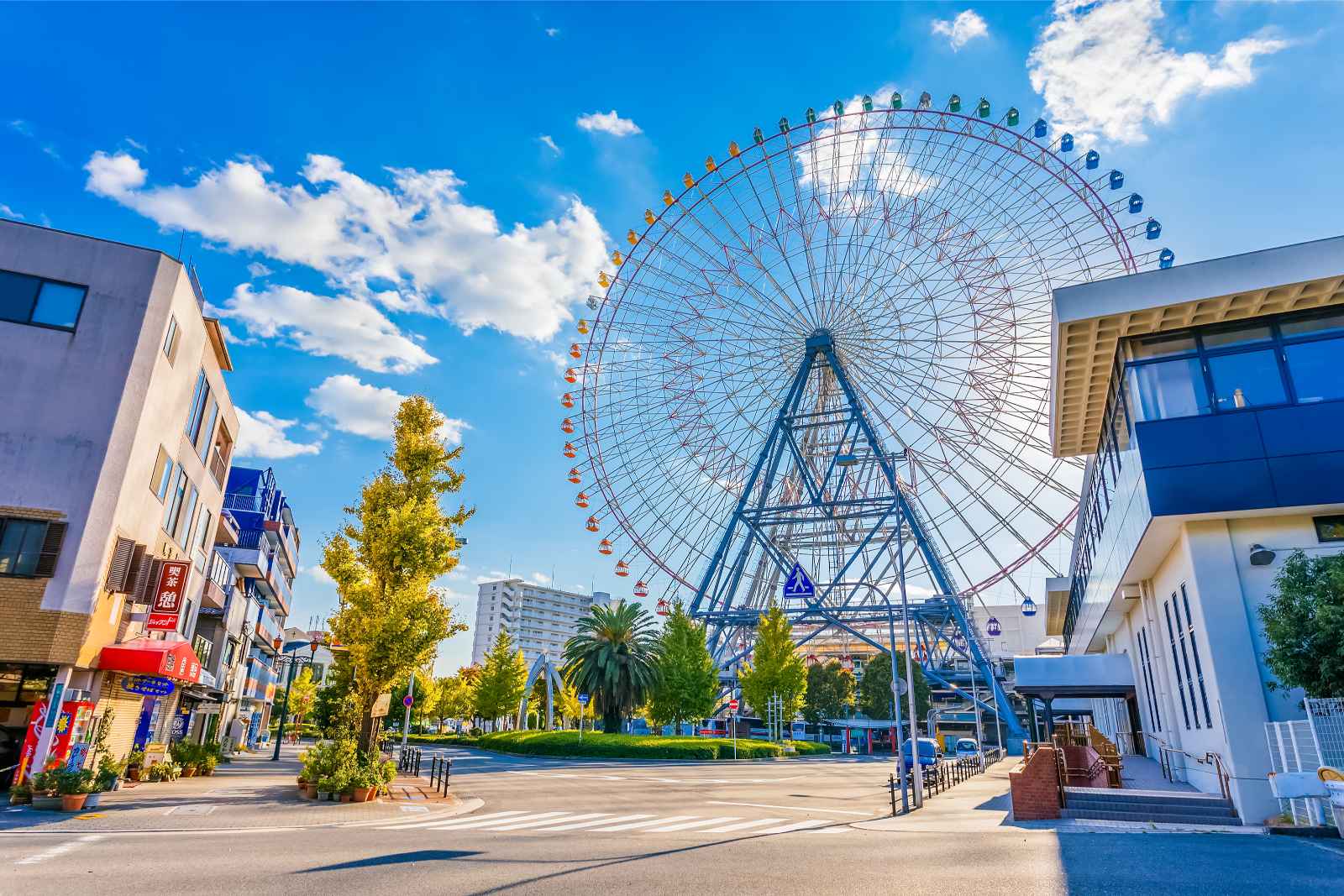 テンポザンの巨大フェリスホイールは、小さな川の島に設置されています。それは、素敵な緑のテンポザン公園にある大阪水族館とレゴランドディスカバリーセンターの隣にあります。フェリスホイールの高さは112.5メートルで、一度に最大480人の乗客に収まることができます。これは、上から大阪の壮大な景色を提供する巨大な構造です。