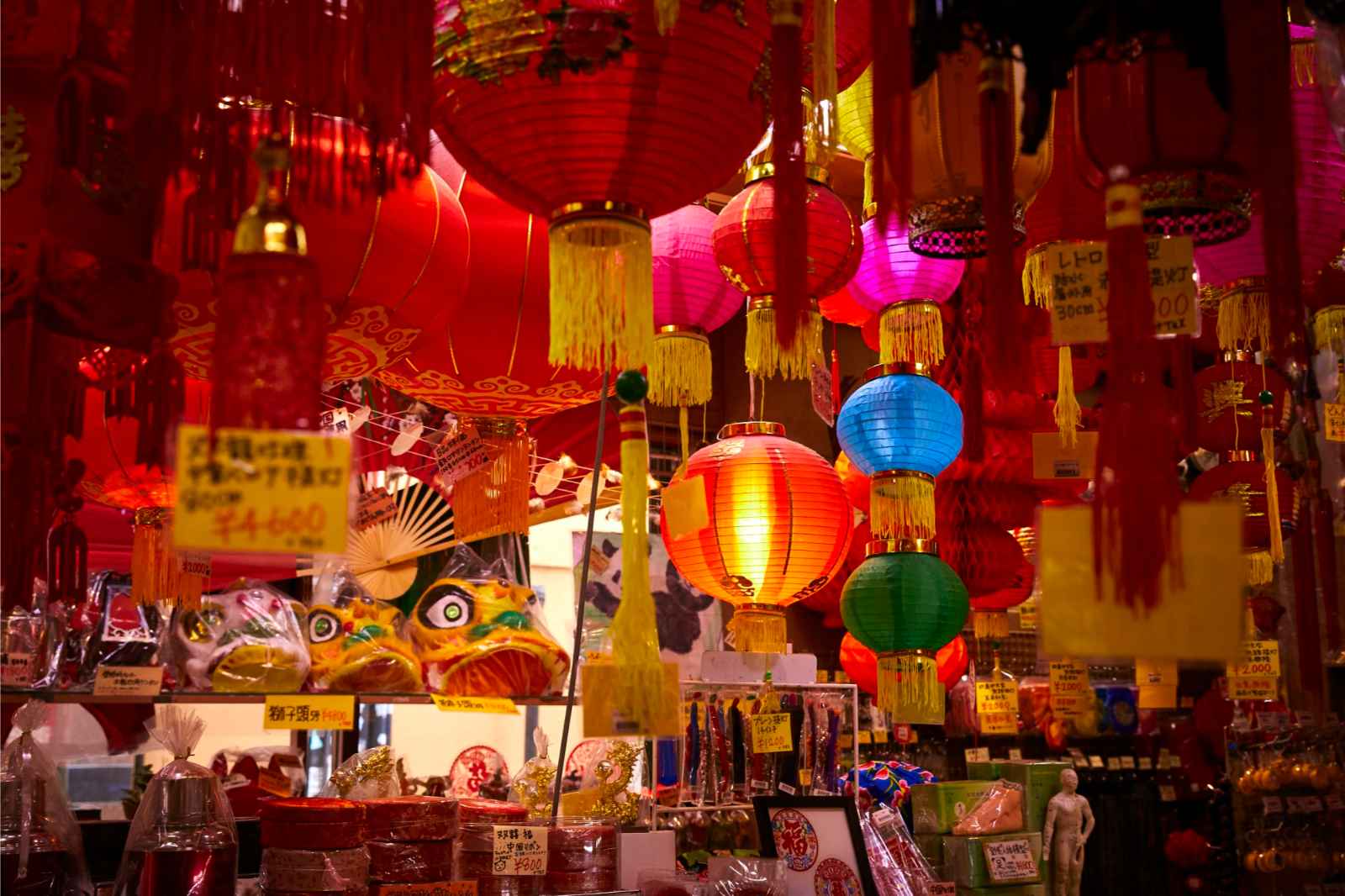 安い屋台の食べ物、お土産店、アーケードゲーム、パチンコパーラー、明るいネオンサインをお楽しみください。