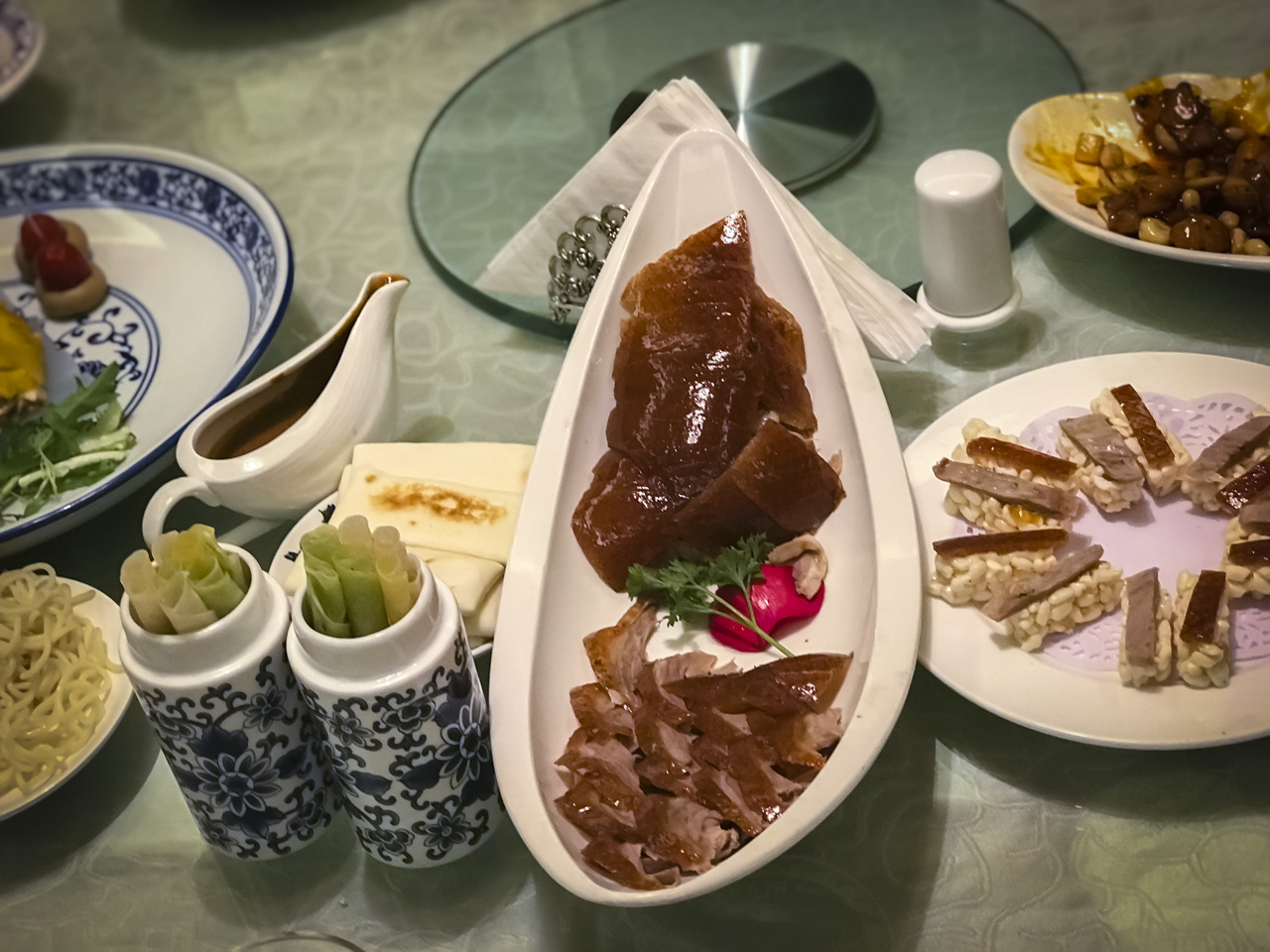 ピーキングローストアヒルのサービングは、シェフが完璧に調理された大きなアヒルを引き出し、それを正確で芸術的にスライスするので、贅沢です。次に、すべての固定具を備えたトルティーヤのようなサンドイッチを作成することで、それを食べる方法が示されます。私は普段はアヒルを食べませんが、北京にいるとき、私はいつも彼らの有名なローストアヒルを食べます。