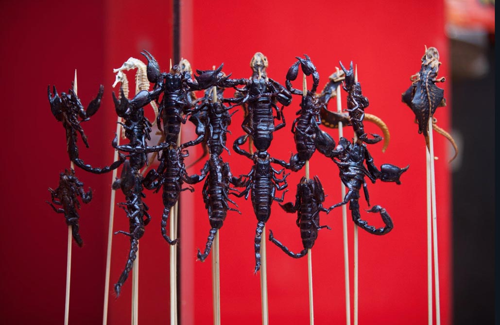 ワンフジンストリートは、特に夜は忙しい賑やかな通りです。日中は人気のあるショッピング地区ですが、夜は非常に忙しい市場に変わります。これはあなたが北京の奇妙で奇抜なものを見る場所です。海馬、サソリ、ヒトデは串に供給されます。一部のサソリはまだひっくり返っており、それは心のかすかな人のためではありません。 (それもとても悲しいことです)