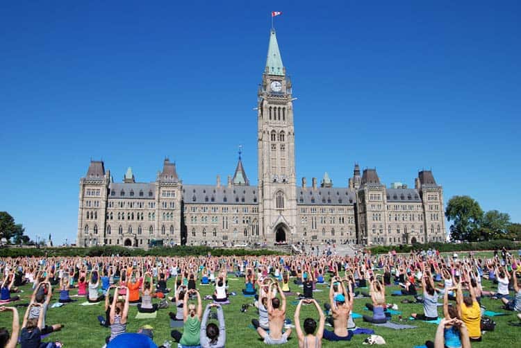 写真クレジット:オタワ観光ジャスティン・トルドー首相は、議会の丘でヨガによって飛び出すことが知られています。毎週水曜日から5月から8月まで、人々は大量ヨガのクラスのために丘の上に集まります。カナダが所有するヨガブランドのLululemon Athleticaが後援する無料セッションです。