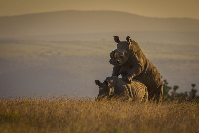 珍しい光景…南アフリカの平原で交尾するサイ。
