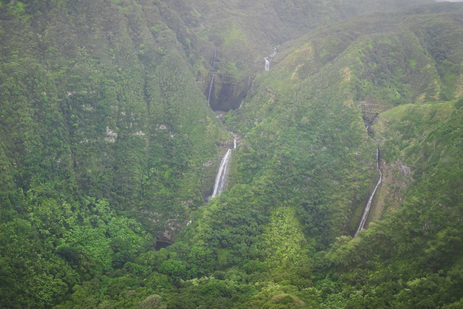 上から、島の真の色の色の色は完全に展示されています。ナパリ海岸の暗褐色の崖に衝突するにつれて、太平洋の深い青が白に消えています。崖が上昇すると、ブラウンズは深い熱帯雨林が定着するまで、軽いオレンジとグリーンと混ざり合います。島のヘリコプターは実際に滝のふもとに着地しています。