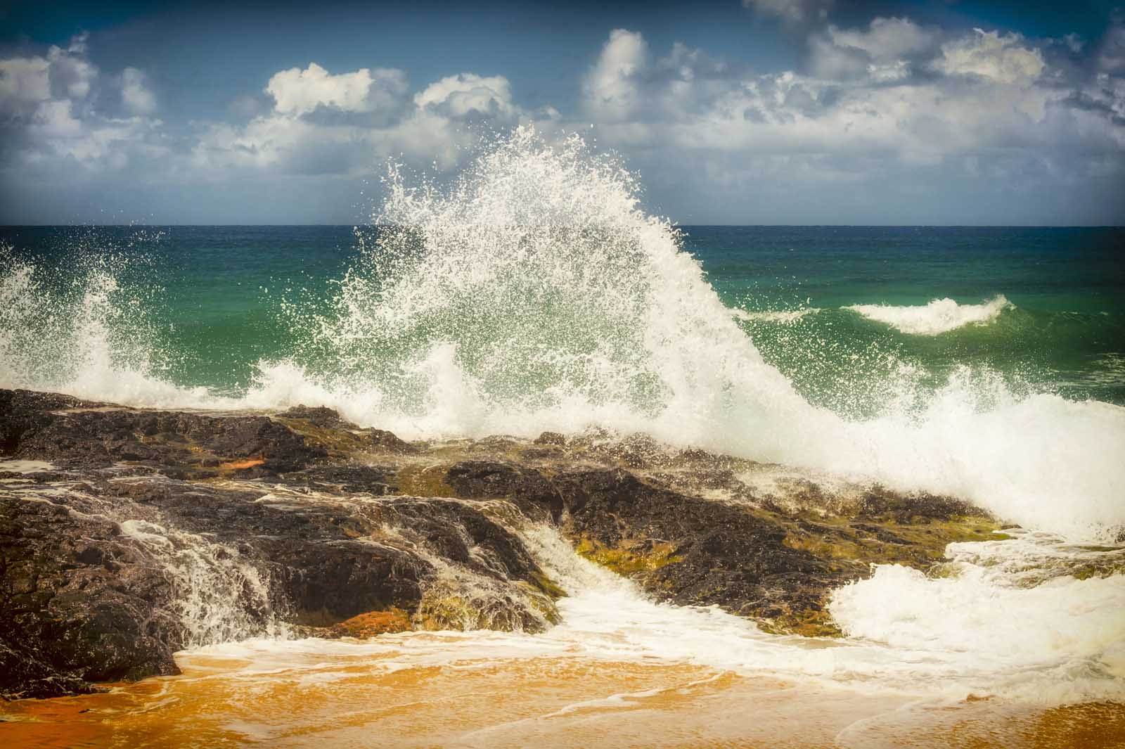 天然の浴槽の左側には、いくつかの小さな滝が注がれているミニチュアの崖があります。落ちるにつれて、風呂が上がり、海とともに落ちて、見事な光景を作り出します。訪問するのに最適な時期は、カウアイ周辺の水が落ち着く傾向がある夏です。冬には、荒れたうねりがあるため、クイーンズバスは壮大ではあるが危険な泳ぎの場所になります。
