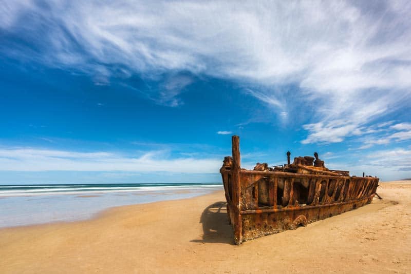 フレイザー島のマヘノ難破船世界最大のサンドアイランドであるフレイザー島は、長さ75マイルのビーチのため、オーストラリアで最もクールなオーストラリアの場所の1つです。世界で最も長いビーチの1つです。ヌーサの町で四輪駆動トラックを借りて、あなたが今まで持っている最もワイルドなドライブの1つに冒険を始めましょう。砂丘、ディンゴ、潮のプール、難破船のある島です。