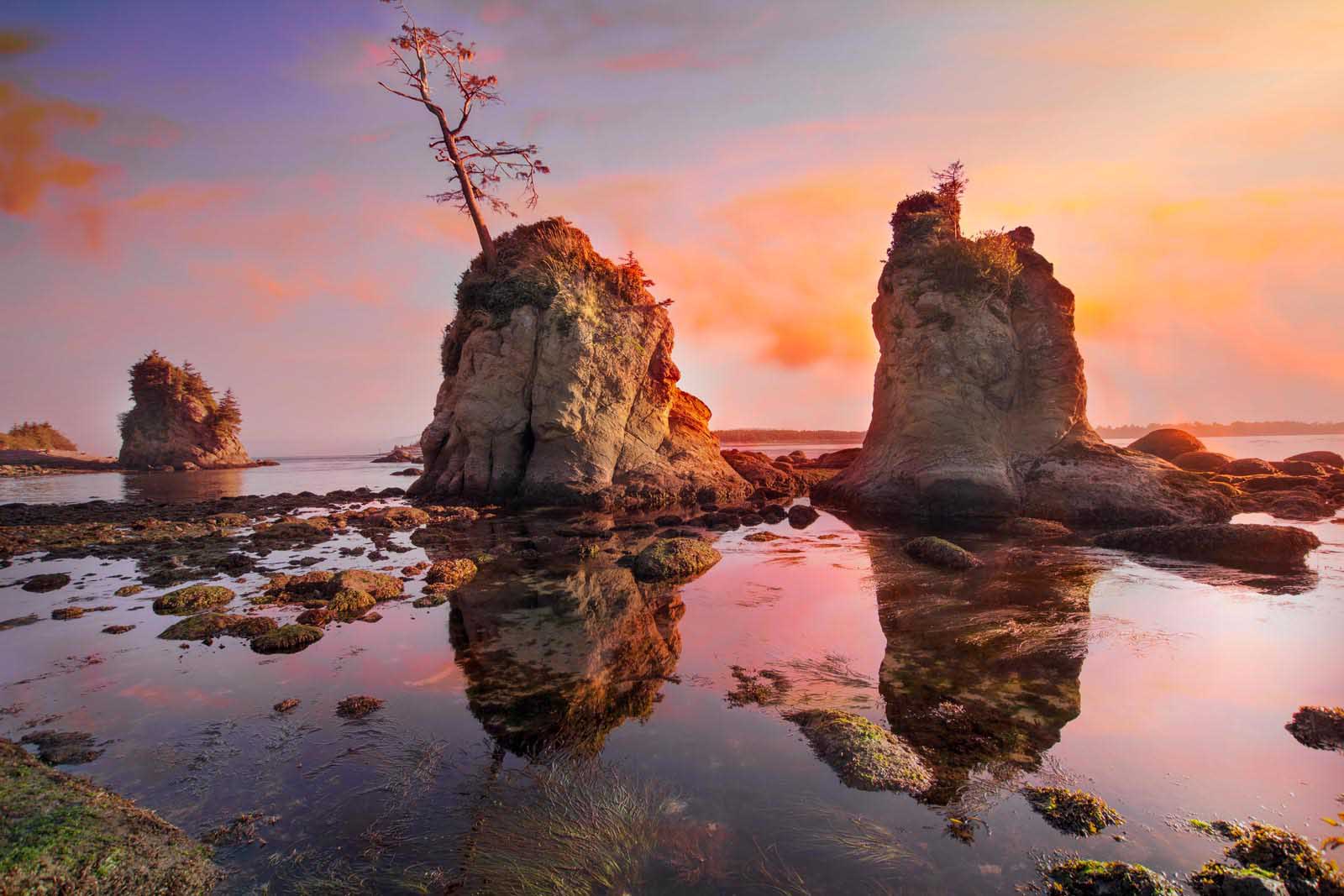 キャノンビーチは、ヘイスタックロックスタンディングガードを備えたオレゴン州で最も有名なビーチです。 Haystack Rockは、海岸線の端から235フィート上昇し、印象的なシーンを作成します。