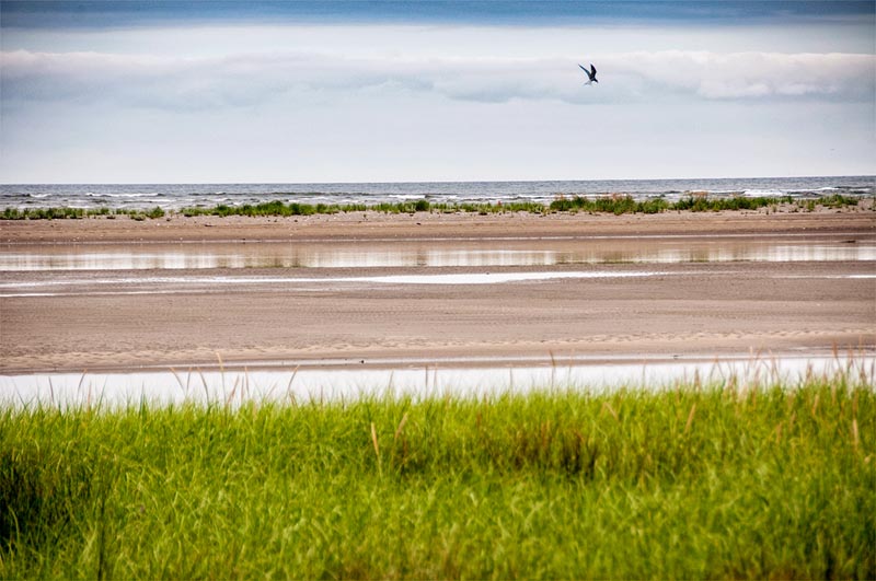 公園の238平方キロメートルに詰め込まれた多様性は驚異的です。沼地、森林、河口、川はすべて植物や動物の種でいっぱいですが、Kouchibougiacの最も注目すべき特徴は、砂丘に挟まれた、その長い手付かずの砂浜のビーチです。