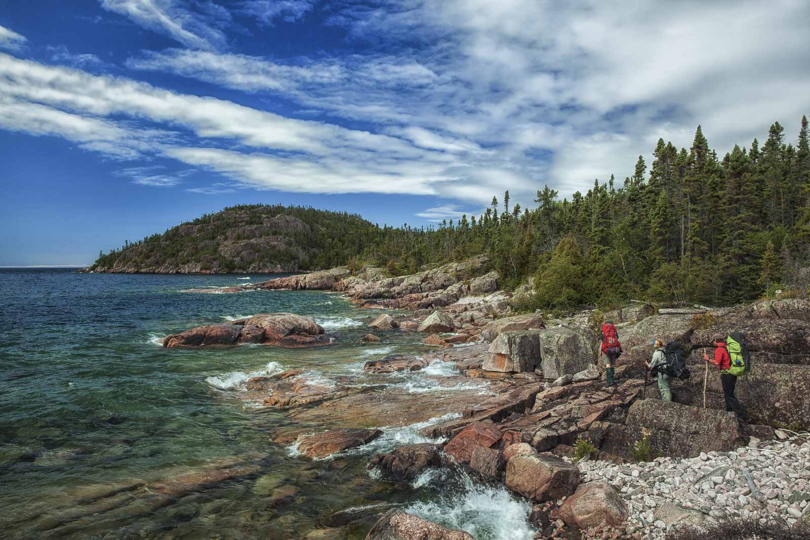 すべての装備を持ち運んで搬出する必要があるため、食料が入ったパックは重くなります。必ずステリペンを詰めるスペリオル湖から集めた水を浄化するためです。高い海食崖、人けのない砂浜、岩場を巡るハイキングは、とても絵のように美しいです。