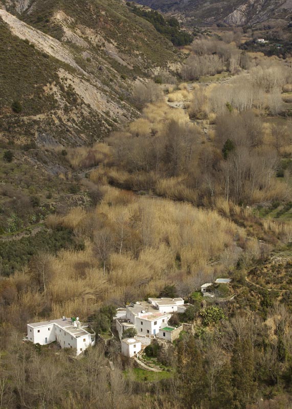 太陽の光が午前中にカピレイラの屋根にぶつかると、村はシエラネバダの高い山頂の下の谷を照らします。