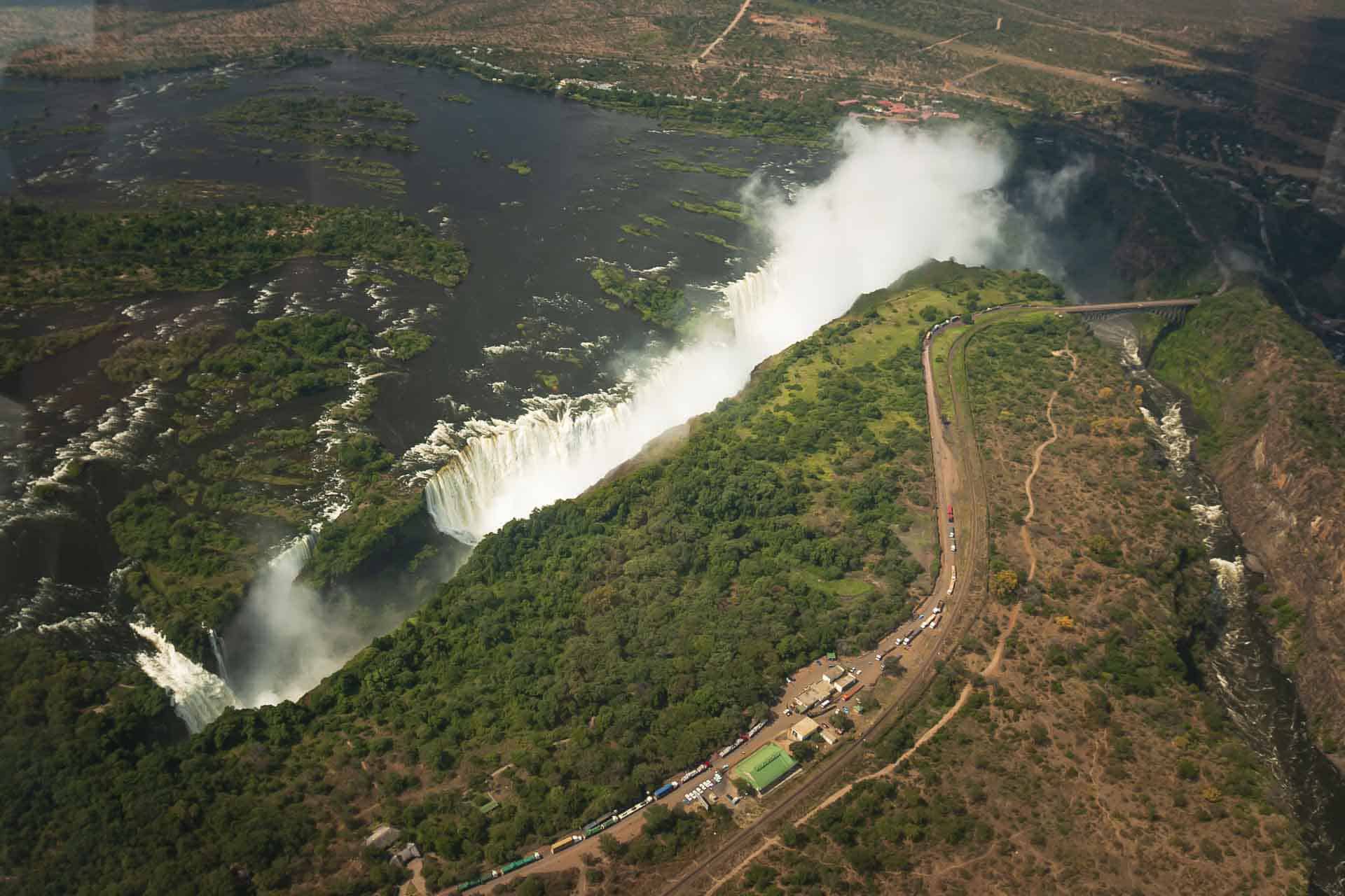 私たちはたまたまカナダのナイアガラの滝から 1 時間のところに住んでおり、その街とカナダの象徴的な滝が大好きです。そのため、ザンビアのビクトリアの滝を訪れる機会があったとき、私たちはとても興奮しました。ザ・フォールズ・ザット・サンダーはモシ・オア・トゥニャ国立公園の中心に位置する世界最大の滝です。ナイアガラの滝とは全く異なり、周囲はジャングルに囲まれています。幅はなんと 1.7 km (1 マイル) と巨大で、ビクトリアの滝の全貌を満喫するには、空中に上がることです。