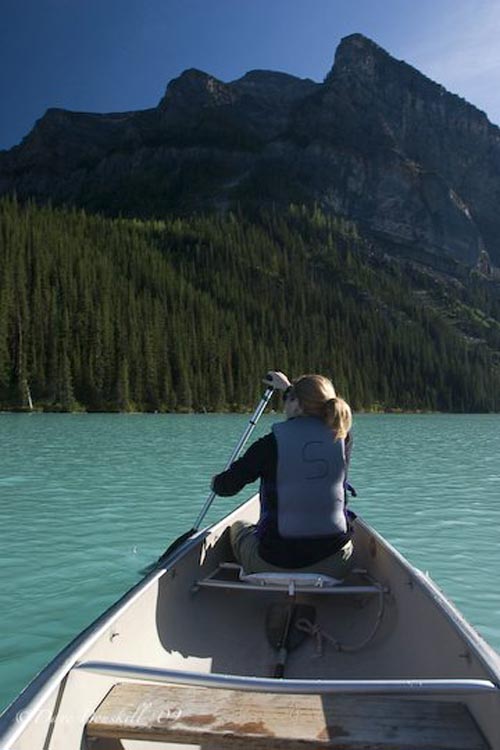 夕方は写真のためにレイクルイーズを訪れるのに最適な時期ではありませんが、ツアーバスがそれまでに移動して以来、午後遅くにカヌーをするのに最適な時期です。ですから、最適な絵を描くことの機会のために、その日の早い段階で行くことをお勧めします。
