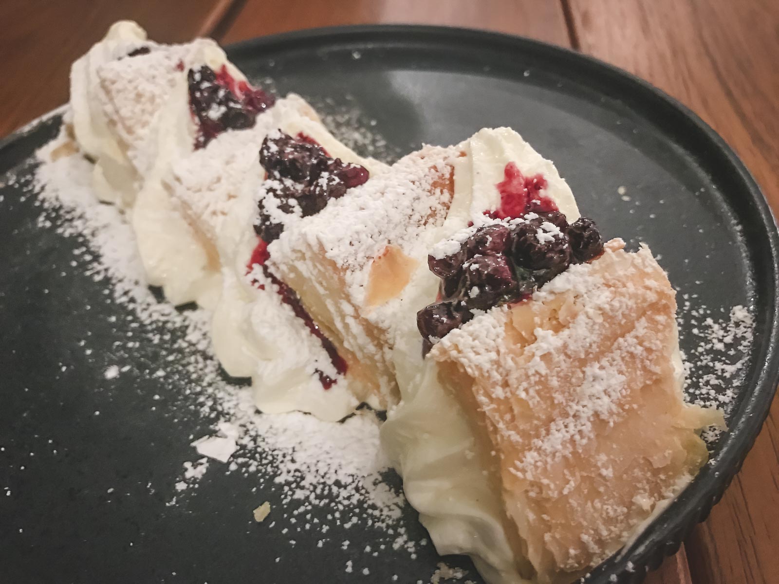 Bougatsaは、クリームを詰めた素敵なパフペストリーで、アイシングシュガーとシナモンで覆われています。