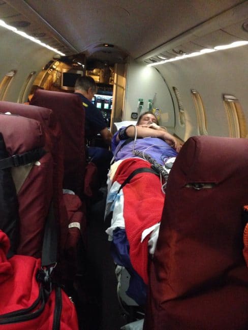 彼は背中に平らにとどまらなければならなかったので、通常の飛行機で家に帰ることができませんでした。