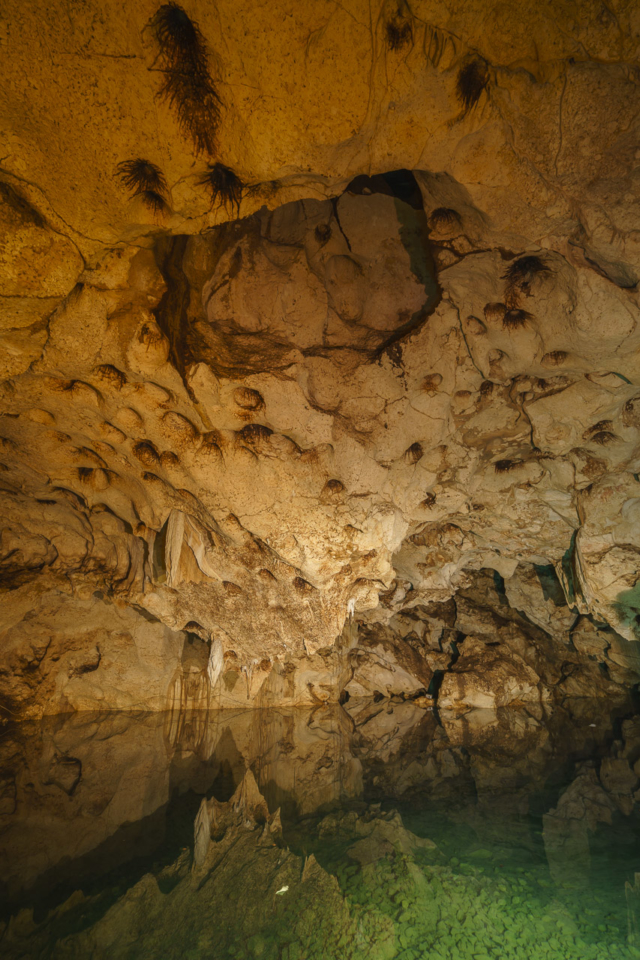 いくつかの新鮮な空気の後、私たちは緑の洞窟の入り口にいました。そこでは45フィート(15メートル)が地下湖です。このツアーでは、水で満たされた大きな洞窟に65歩下がっていきます。ライトが点灯すると、stal乳石がプールに反射し、美しいシーンを作成します。
