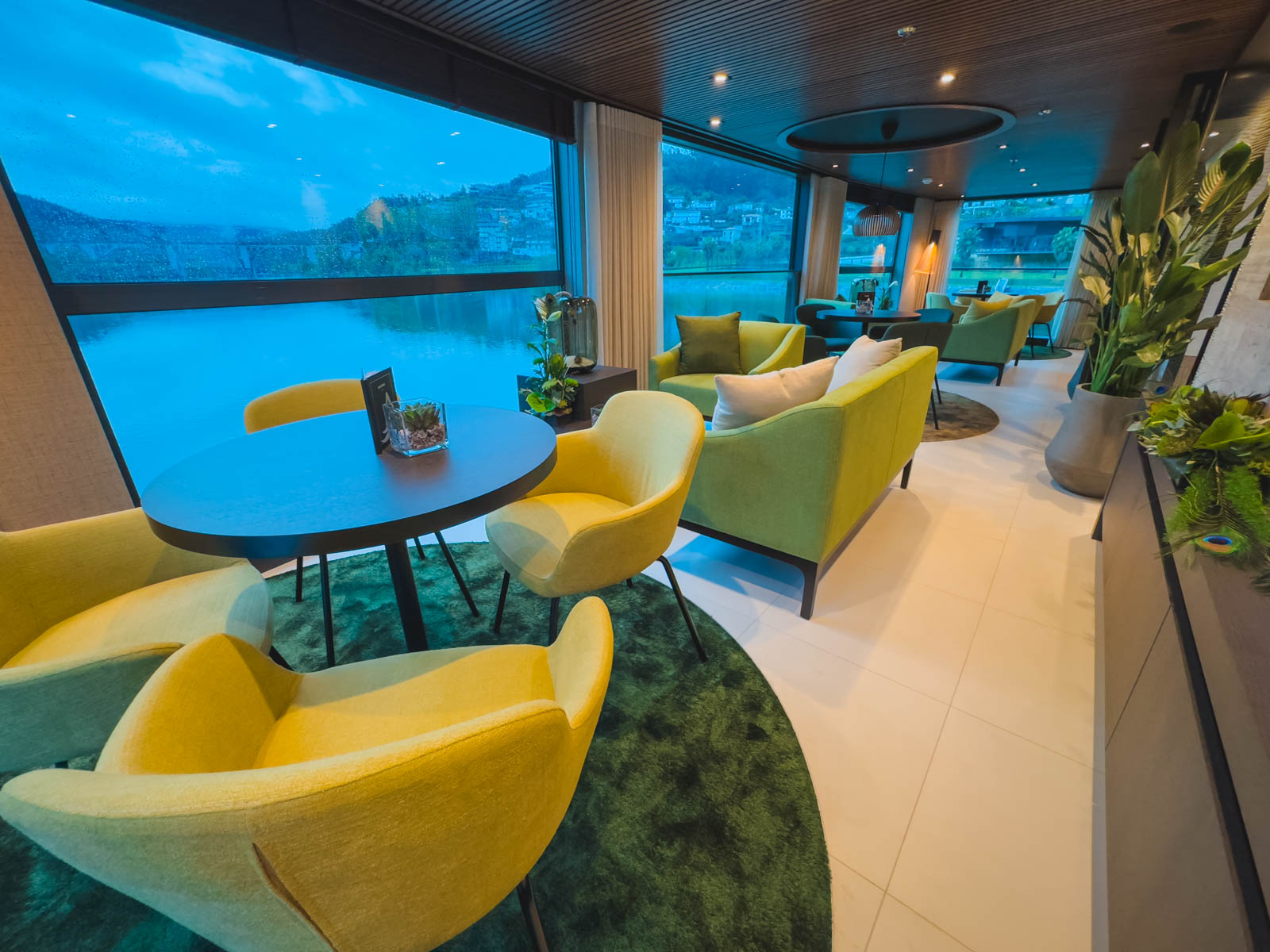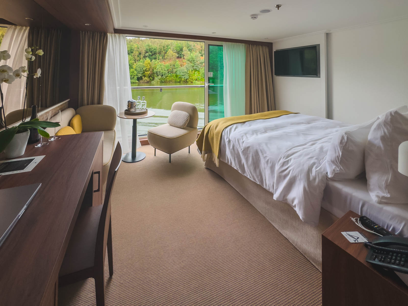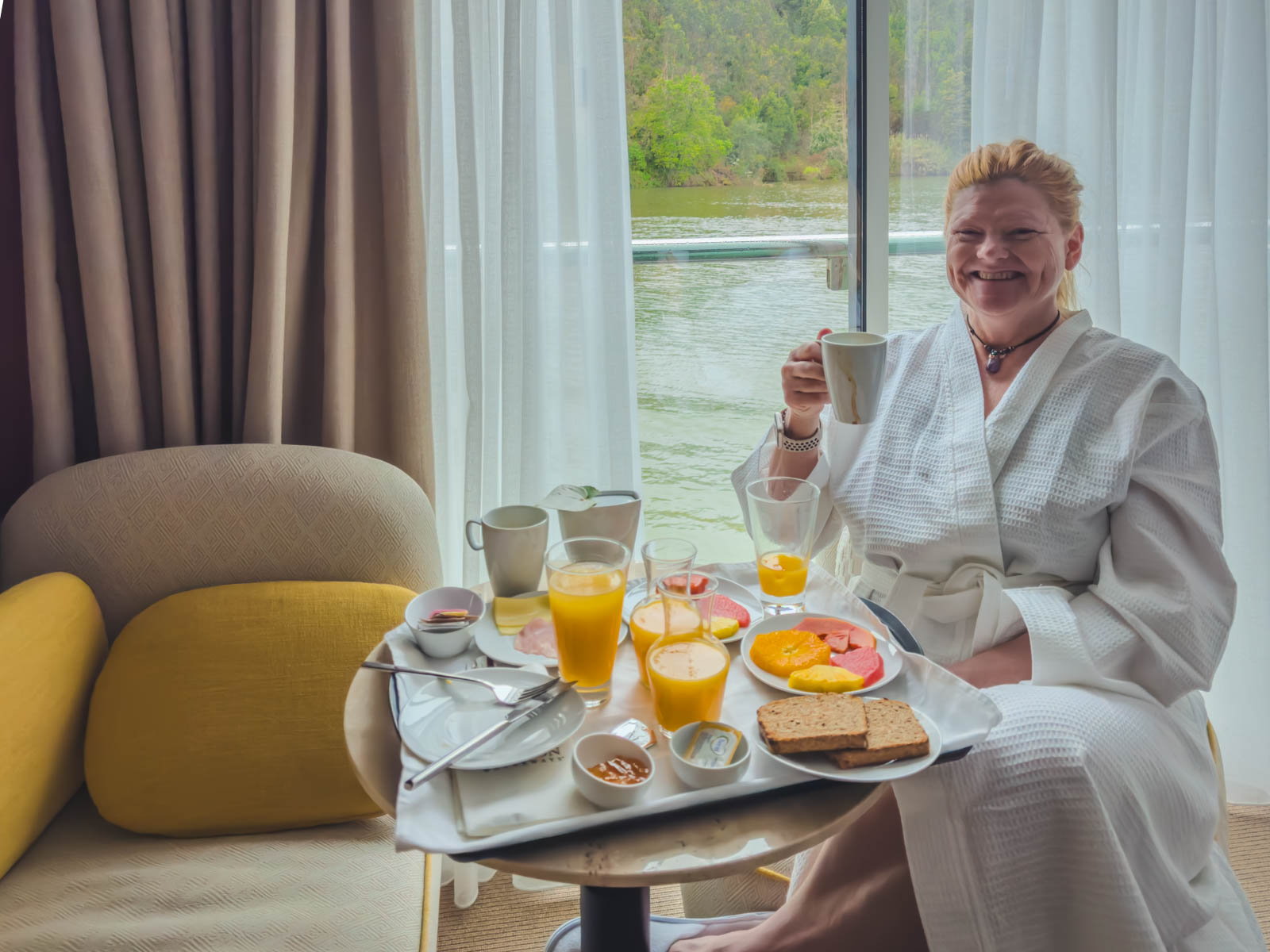 他のクルーズラインは、他の壁の景色を眺めながら壁にベッドを並べていますが、アバロンアレグリア船は、川の景色のために床から天井までの窓に面した各ベッドを設定します。ドゥーロ川の景色が通り抜けるのを見ながら、私たちは部屋で午後のシエスタを楽しみました。