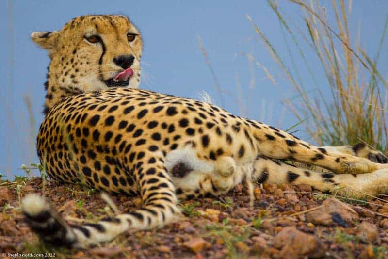 チーターはそのチョップを舐めていますマサイマラでの私たちの最初の外出は、私たちを泥の山の間で寝ているチーターに連れて行ってくれました。 Safari Vansがそのそばに引き上げられたため、世界では世話をしていなかったようです。マサイマラには、車両が動物に近づきすぎないように、道を離れないという厳しい規則があります。