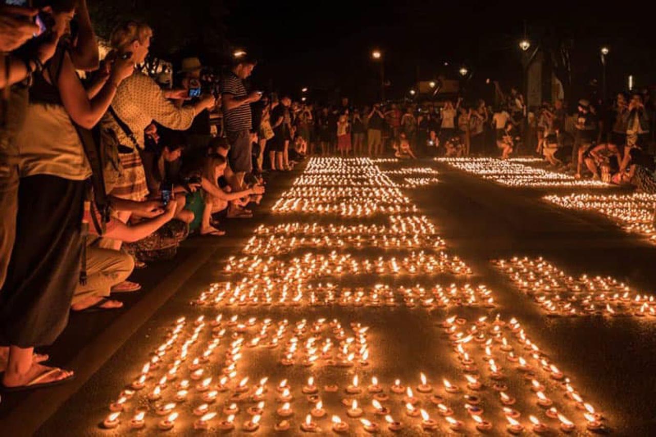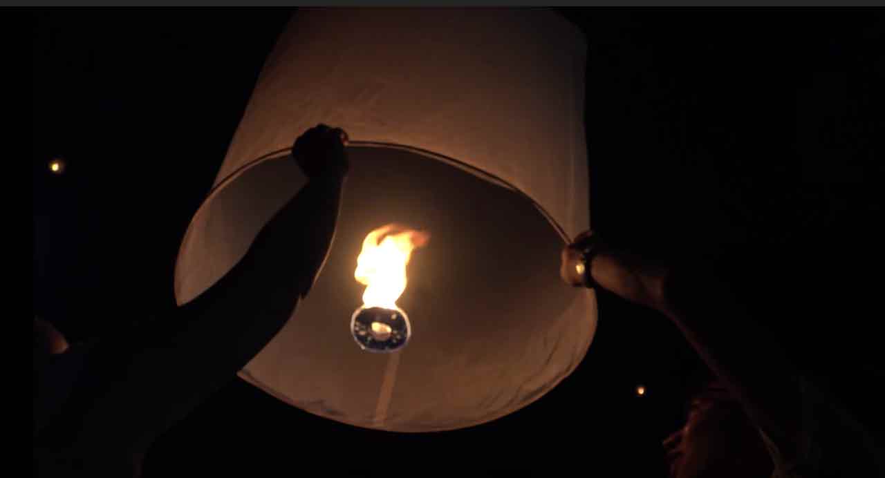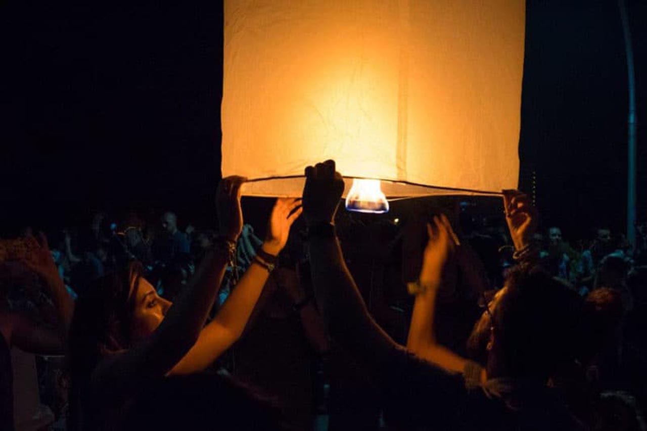 ろうそくはランタンの内側に置かれ、人々が自分の工芸品を照らすと、彼らは願いを唱えます。炎はランタン内の空気を加熱し、火が消えるまで空に浮かぶ場所で上昇します。夜空の輝く星のように何千もの光が輝くのを見るのは信じられないほどの光景です。