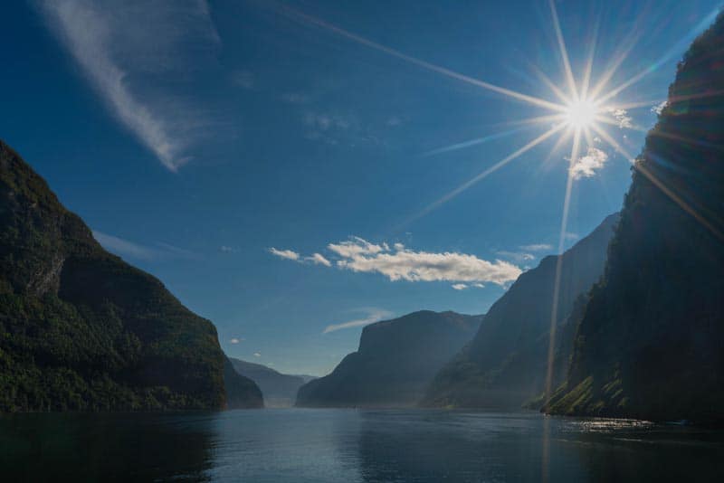 ノルウェーのフィヨルドの上のスターバーストサンわずか20 kmの長さで、私たちは山に囲まれたこの狭い腕を空に至る1700メートルに達するこの狭い腕を巡航しました。