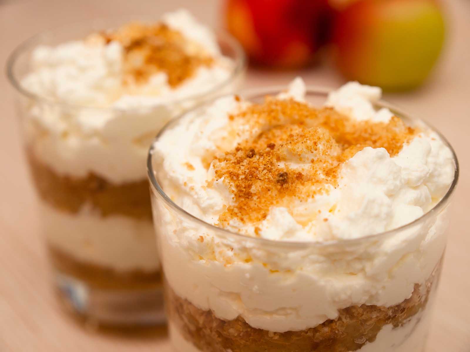 デザートは通常、すべての層を高く評価できるようにガラスボウルで作られています。ホイップクリーム、アップルソース、パン粉で構成されており、提供する前に砂糖を大量にローストしています。パンくずが湿っていないように、すぐに食べるのが一番です。