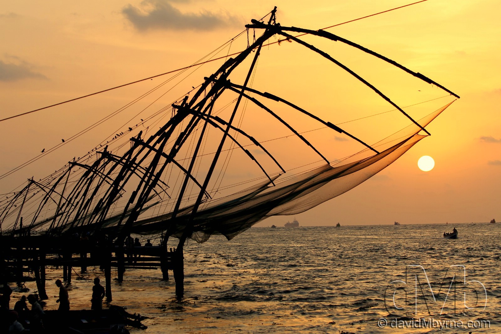 インドの日没時の漁師これらの巨大な片持ち中国の漁網、ケララ海岸の非公式の紋章、コーチン砦の北端、歴史に染み込んだ場所に点在し、3、000年以上にわたってスパイス貿易センターであり、ヨーロッパの植民地化が根付いたインドで最初の場所であり、多くの場所で植民地時代の過去に生きたままです。
