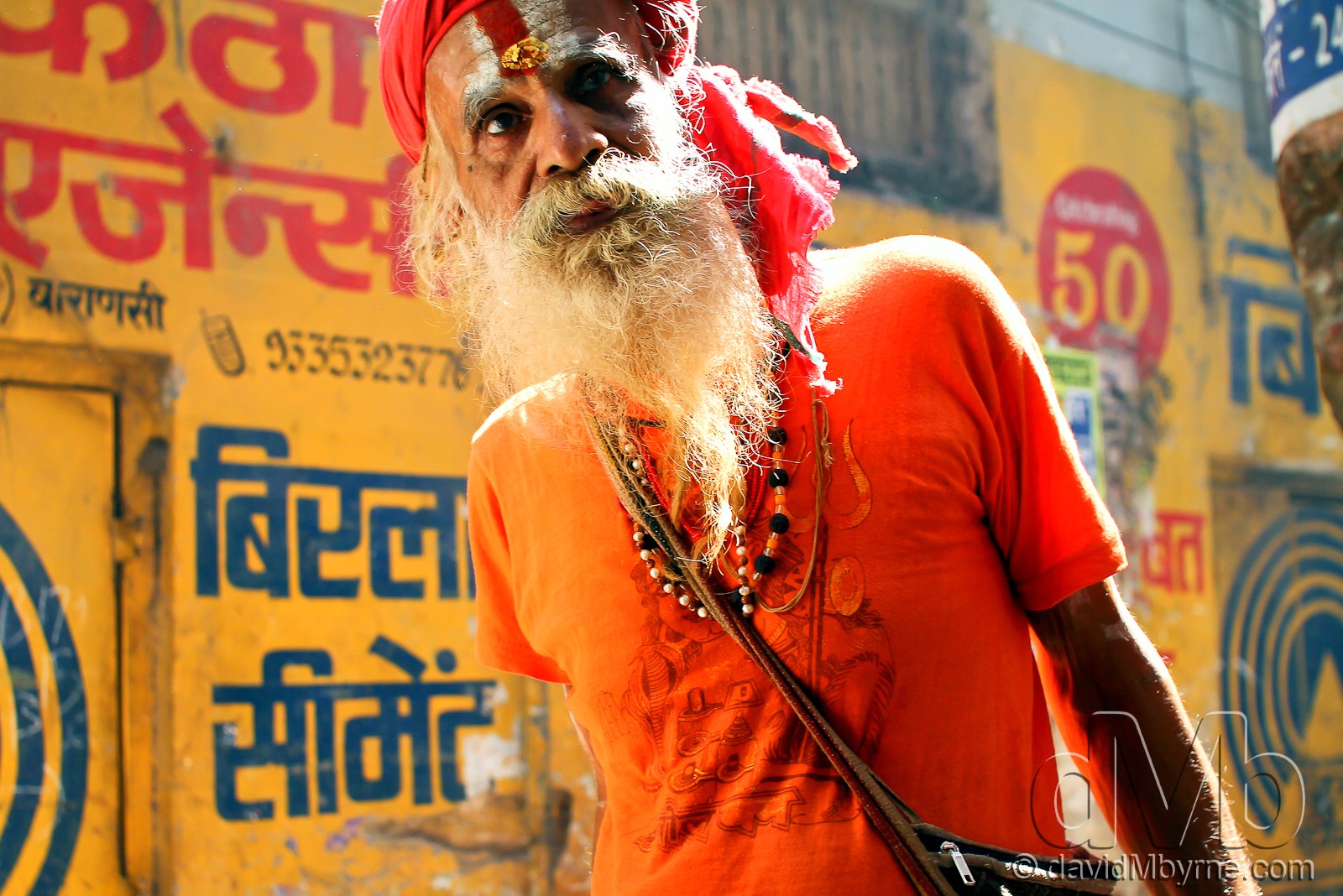 インドのウッタル・プラデシュ州バラナシの旧市街の車線にある、禁欲的なヒンディー語の聖人であるサードゥ。
