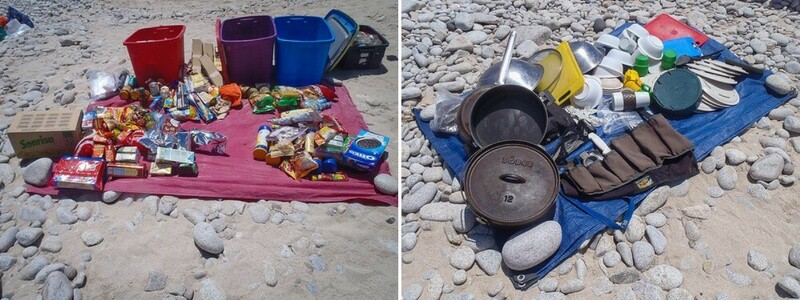 私たちの海のカヤックアドベンチャーのためのすべての物資果物を詰めたボート、野菜を詰めたボート、他のボートには缶詰の商品、乾燥肉、スナックがありました。ボートは日陰、ストーブ、テーブル用のテントを運んでおり、誰もが少なくとも1つの10リットルの膀胱(時には2)の淡水を座席の後ろに持っていました。水はシャワーやすすぎのためではありませんでしたが、それは厳密に飲酒と調理用でした。