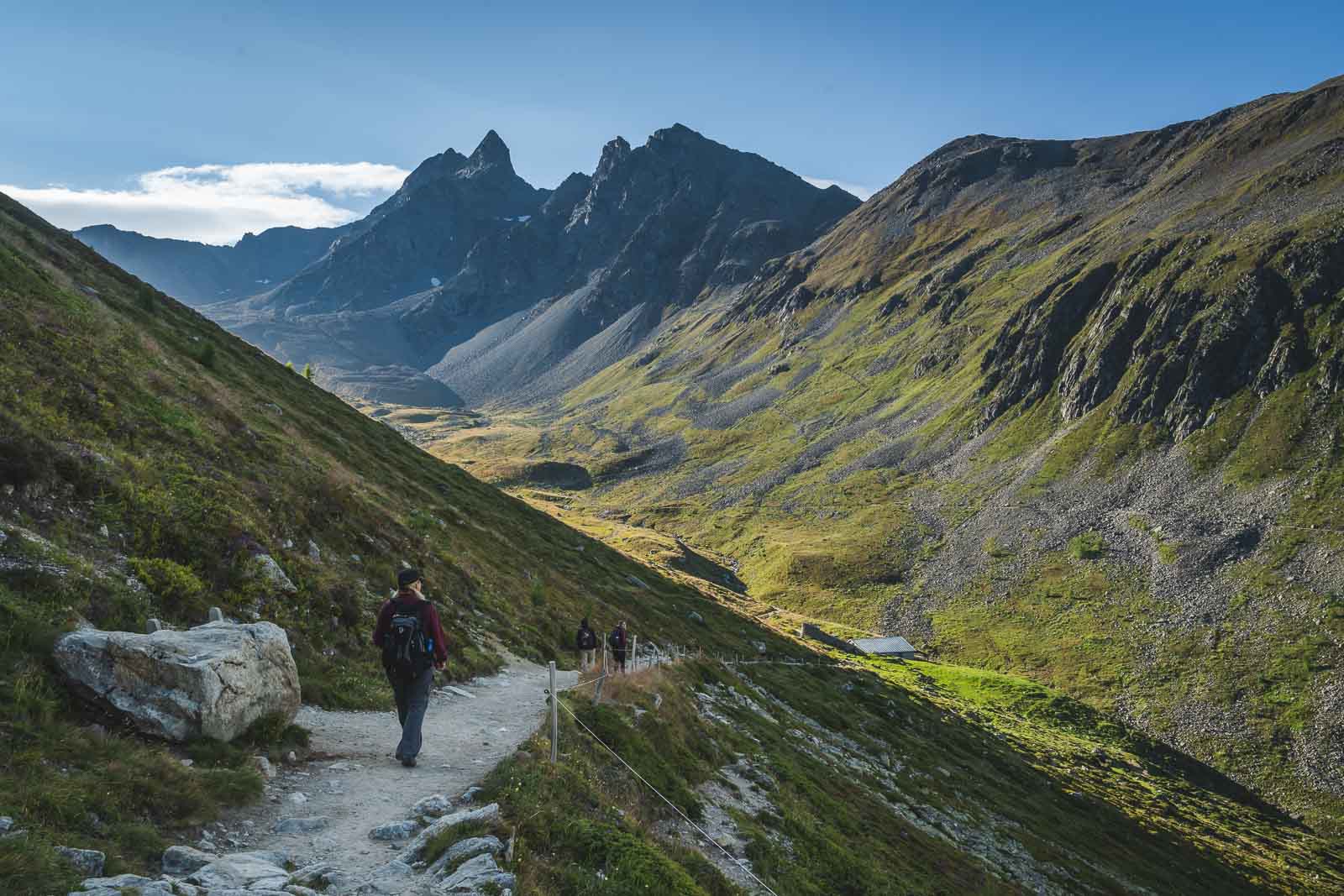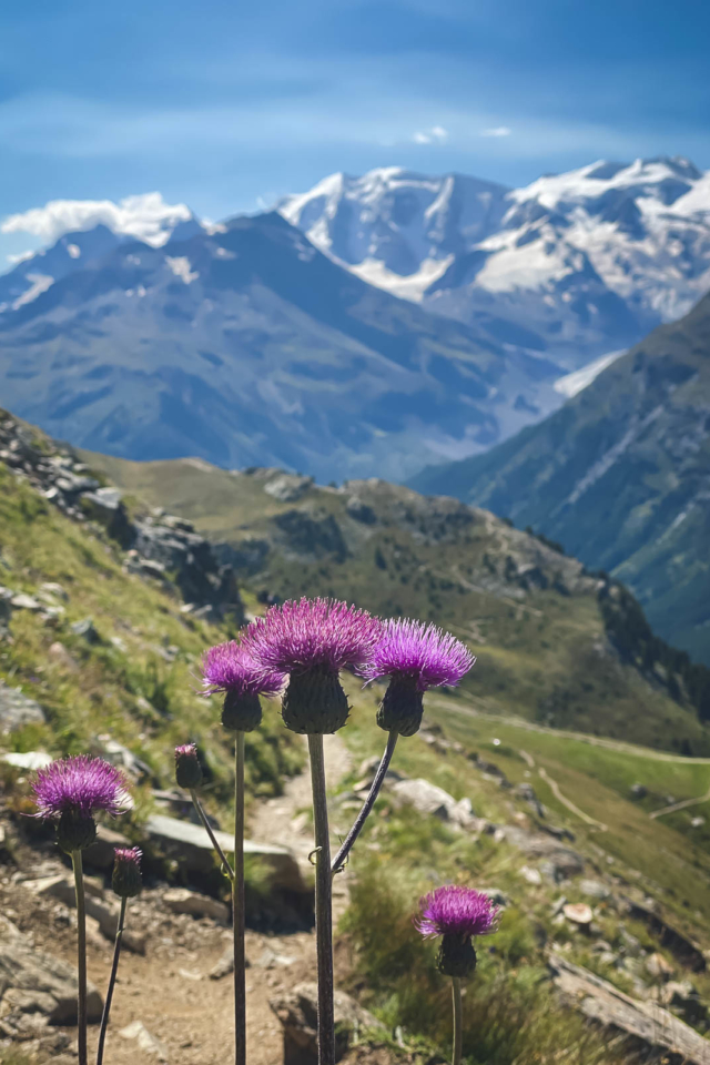 アルプスのさまざまな範囲がムラグル渓谷のムラグル渓谷のベルニナレンジタワーから谷に向かって突っ込んでいるため、片側から他方へとハイキングするにつれて、景色は変わり続けます。このような景色は、山と氷河のこのような劇的な見方を見るとは思っていなかったので、私たちを不意を突かれました。そのシーンはZermattまたはGrindelwaldのために予約されていると思いました。