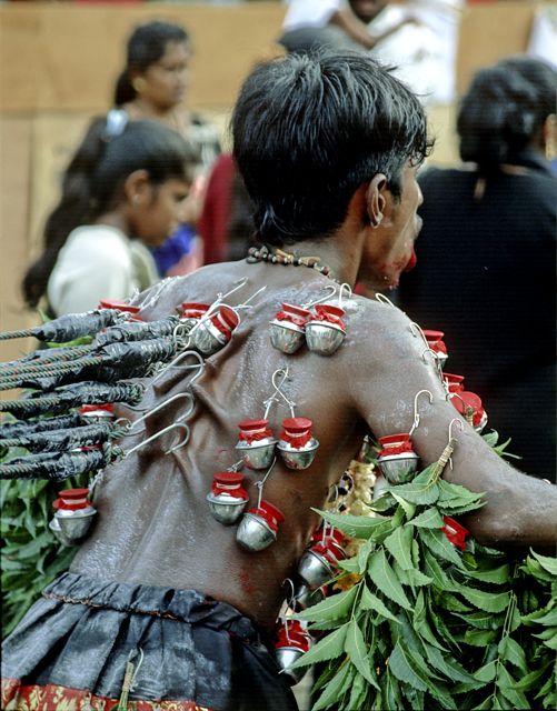 これらの献身的な人々は、頬や舌を通り抜ける司祭のドライブスパイクを持っているか、フックを背中と胸に挿入して、さまざまな果物やミルクポットを吊るして不快感を増します。