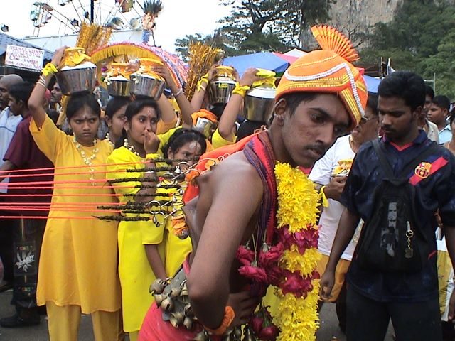 タイのタミル月の満月の間に祝われ、(1月または2月)Thaipusamは、ムルガンLordに敬意を払うために何千人もの信者を引き付けます。それは、信者がピンとスパイクで穴を開け、フックで胸からぶら下がっている、そして戦車を引っ張るか、フックで背中に背中に付着した重いロープにぶら下がっているカラフルで衝撃的なヒンドゥー教の祭りです。