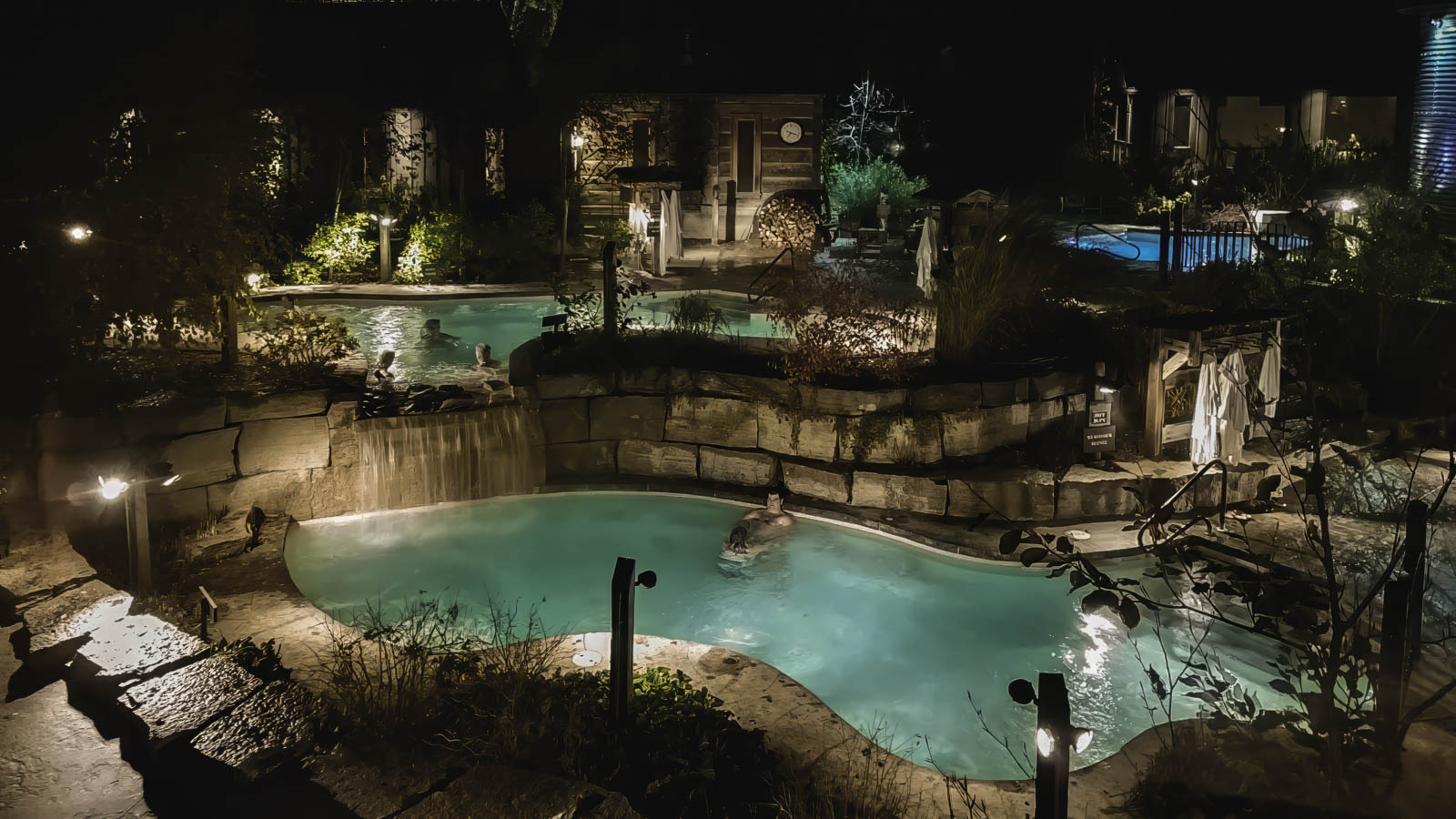 これらの驚くべきハイドロセラピースカンジナビアのバス、加熱されたサーマルプール、北欧の滝は、ブルーマウンテンリゾートでのオンタリオ州の最高のスキー斜面からの石の投げです。