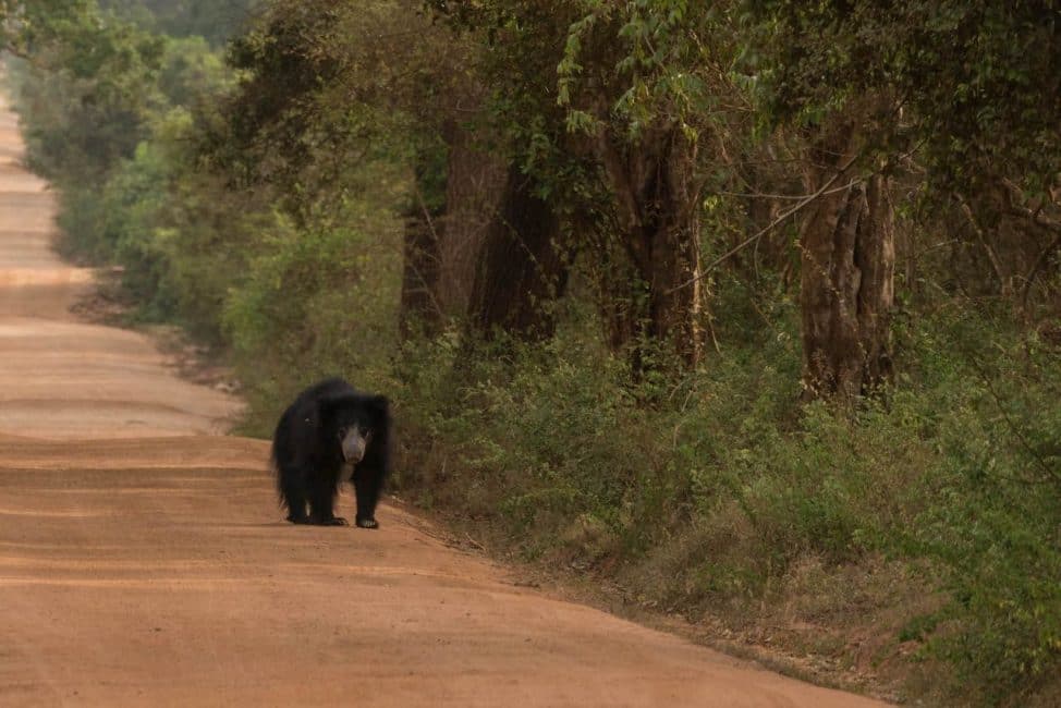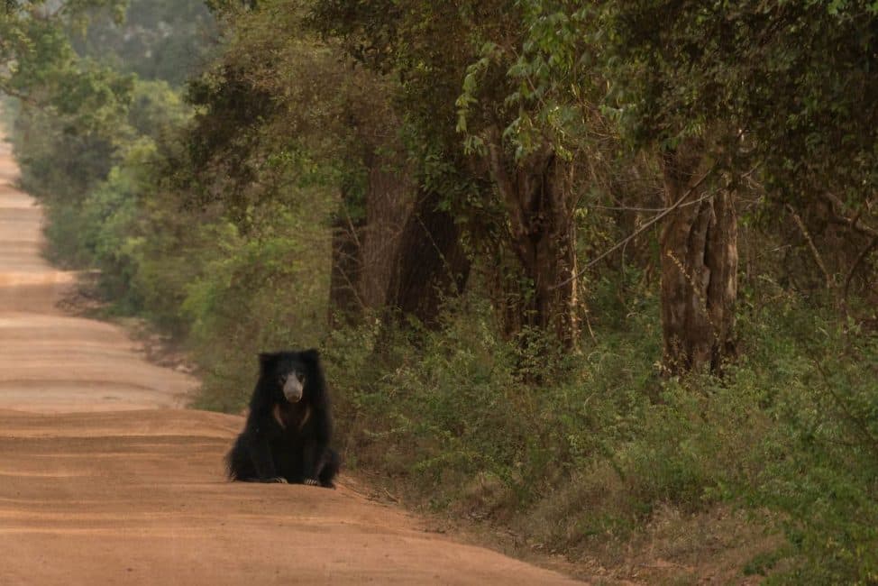ナマケモノのクマが歩いています私たちはサファリの間に3人のナマケモノのクマを見つけることができました。最も興味深い出会いは、道路を歩いているクマに出会ったときでした。私たちのドライバーは彼を見るために立ち止まり、逃げる代わりに、クマは道の真ん中に座って私たちを見ました。彼は私たちをほとんど大胆に近づけるように大胆にいました。