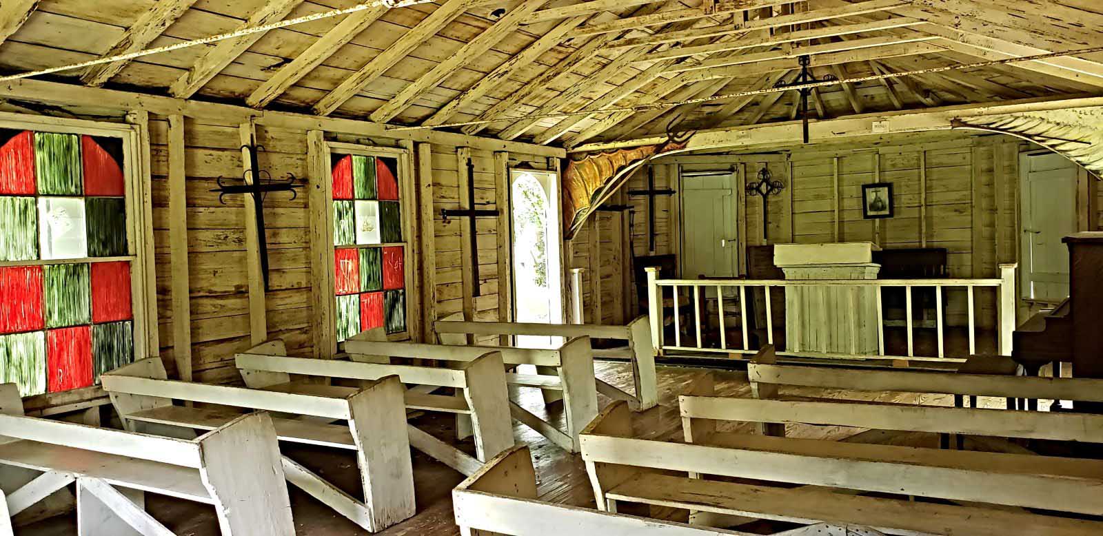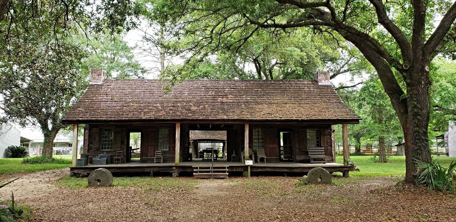 フォークアーキテクチャセクションには、ステンドグラス、パイオニアのキャビン、さわやかなドッグトロットハウスの代わりに塗装された窓がある美しい素朴な教会があります。いわゆるショットガンの家の優れた例は、長くて狭く、単一の廊下から部屋があり、ローズブッシュに囲まれた道路の隣にあります。このスタイルの家はニューオーリンズで一般的です。アカディアンの家には、10代の恐怖になったら少年たちが寝室を持っていた2階のガルソニエールにつながるはしごがあります。