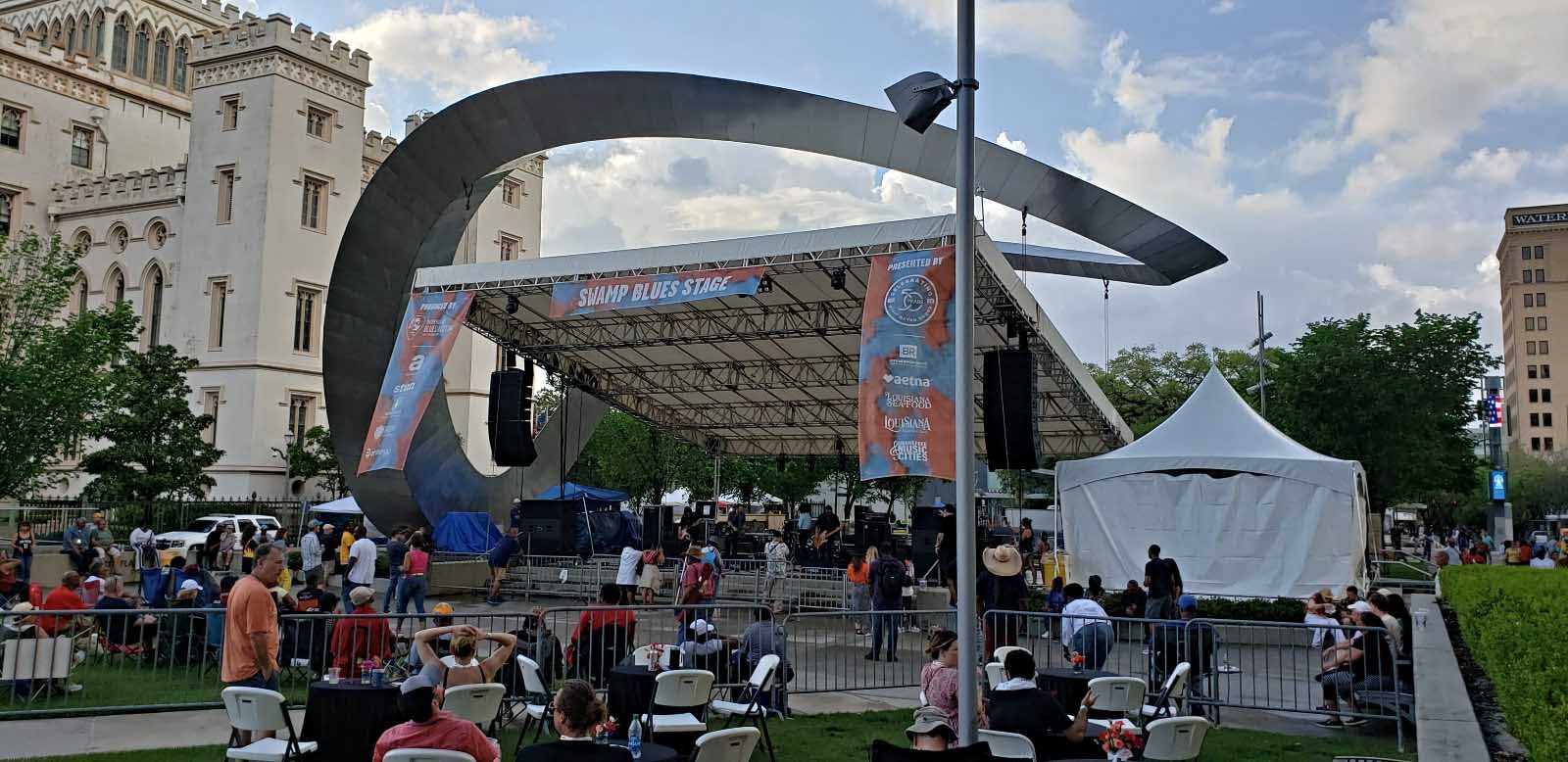 私は閉店時に国会議事堂の建物から追い出され、通りを渡ってバトンルージュブルースフェスティバルフルスイング。この2日間の無料イベントは、1981年から毎年春に開催され、パンデミックのための短い休憩があります。自家製のバトンルージュの品種である「Swamp Blues」を祝います。ダウンタウンモールの周りには4つのステージが散らばっており、色合い、冷たい飲み物、スナックがあります。