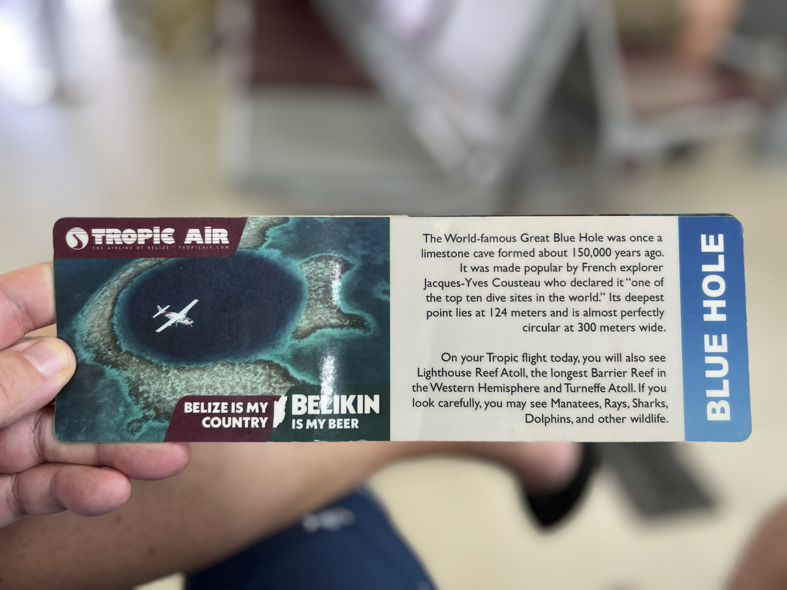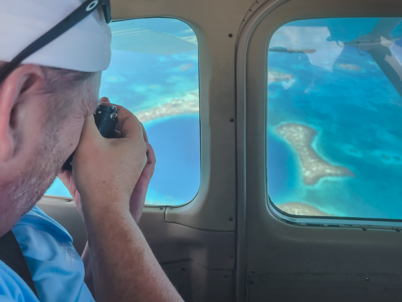 私たちの飛行機がサイトを一周したとき、私たちは興奮にうんざりしていました。私たちのキャプテンは、飛行機の両側に2つの青い穴の周りで4つのパスをしたので、デイブと私はどちらも自然の不思議の十分な景色を眺めることができました。