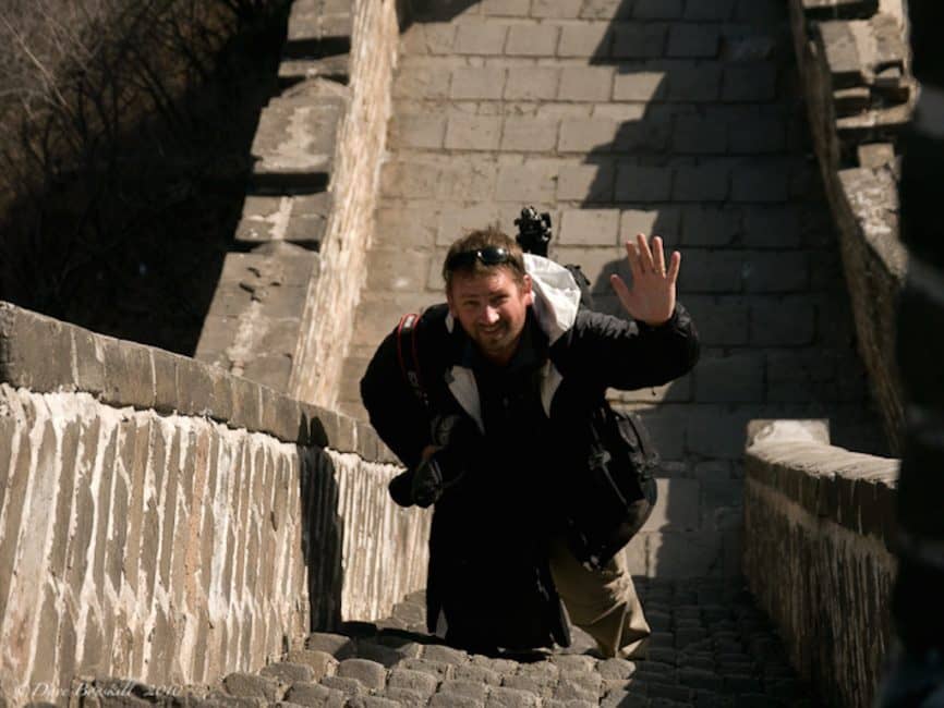デイブは急な登山を楽しんでいます中国の万里の長城は、なだらかな山々に建てられているので、適切な履物を着用してください。山にあるので、必ず層を詰めてください。あなたは汗をかきますが、それは涼しいかもしれません。