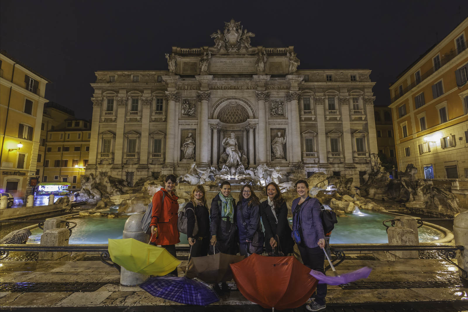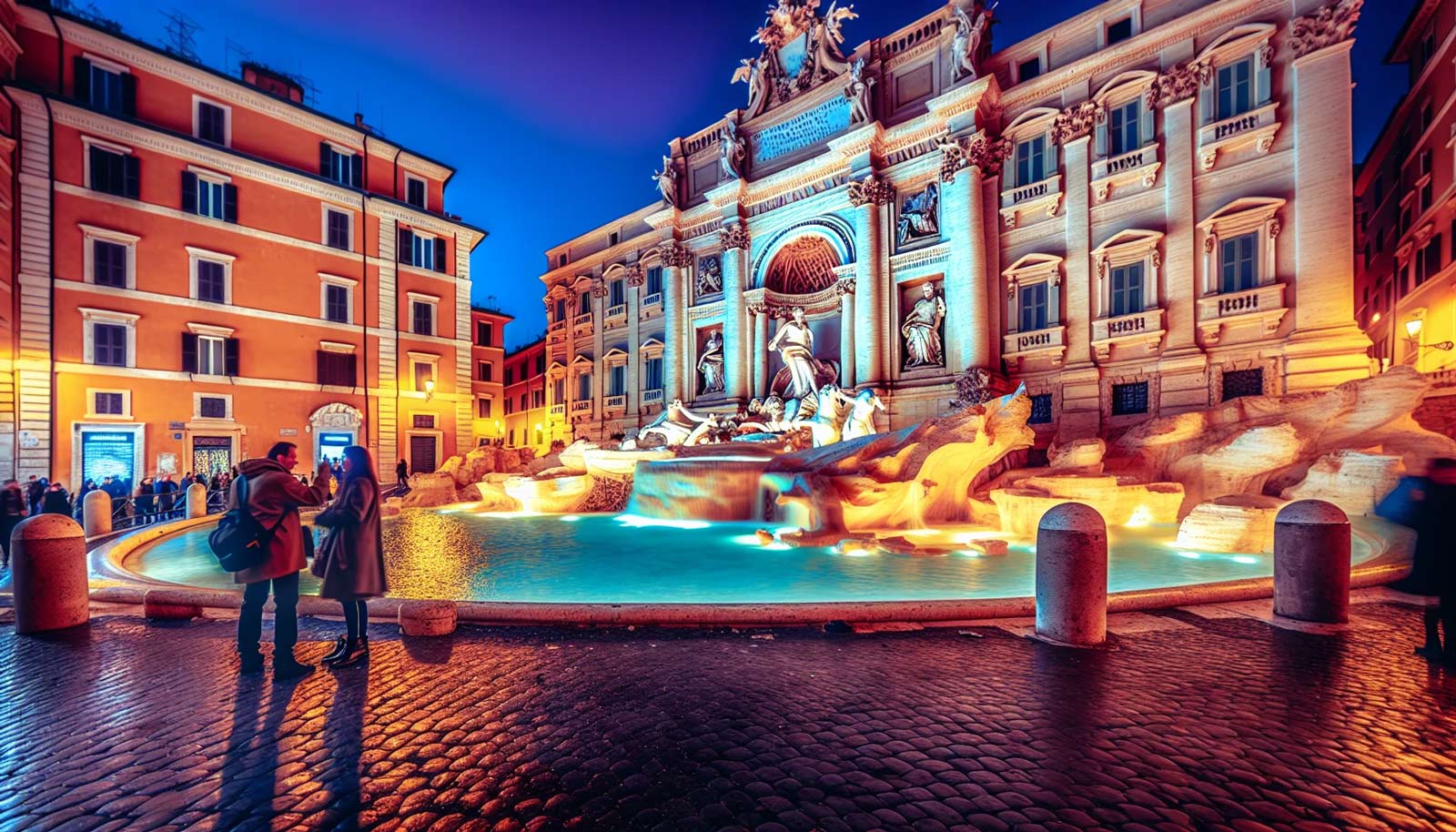 散歩を続けると、象徴的なローマのランドマークであるTrevi Fountainに出くわします。噴水は夜に美しく照らされており、その複雑な彫刻が光の下で輝いています。コインを噴水に投げ込み、願いを唱えることで伝統に参加してください。