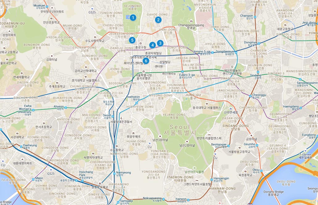 - 別のソウルの近所に滞在している場合、次の光景に最適なメトロストップはGyeongbokgung、Anguk、およびJunggak。