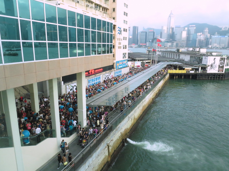 群衆はハーバーシティモールからフェリーに乗っています香港最大のショッピングモールで、世界のすべてのトップネームブランドがあります。買い物以上のものがあります。食事からフェリーターミナルまですべてがあります。それは屋外からの大きな脱出です。
