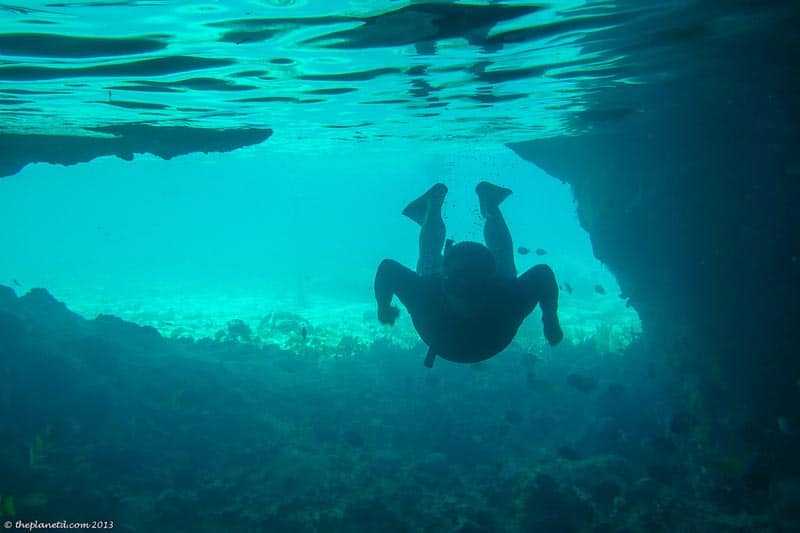 干潮時には、アーチを泳いで洞窟に入ることができます。控えめな島の真ん中にあるこの美しい洞窟は壮観です。あなたが中に入ったら、水の上と下の両方で息をのむほど美しいです!太陽が輝くと岩とサンゴが照らされ、魚の明るい色が日光の梁に輝きます。