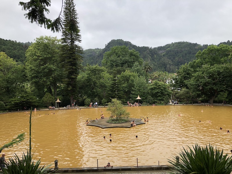 カルデイラ・ヴェルハの暖かい滝とプール、またはファーナスに向かうと、ポカ・ダ・ドナ・ベイジャとパルケ・テラ・ノストラのオレンジ色のプールがあります。