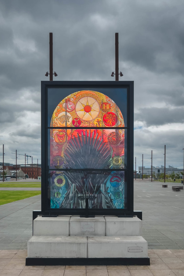スタジオツアーの後、スローンズのグラスは完璧な補完でした。ベルファスト市庁舎からタイタニックスリップウェイズまで散歩して、街の美しいウォーターフロントだけでなく、シリーズから極めて重要な瞬間の6つのステンドグラスの作品を探索しました。芸術の各作品は、スタークス、ラニスター、バラテオン、ターガリエン、ホワイトウォーカー、鉄の玉座を表すゲームオブスローンズの極めて重要なシーンを表しています