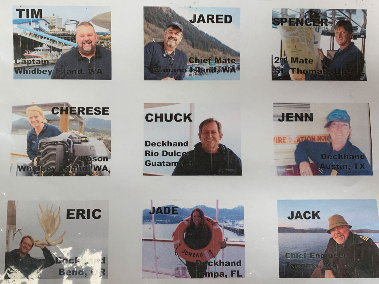 私たちは、他の80人の乗客と一緒にジュノーのSSレガシーに船に乗り込みました。私たちの名前のタグが首に縛られているので、私たちは旅行の終わりまでに全員を知ることに決めました。